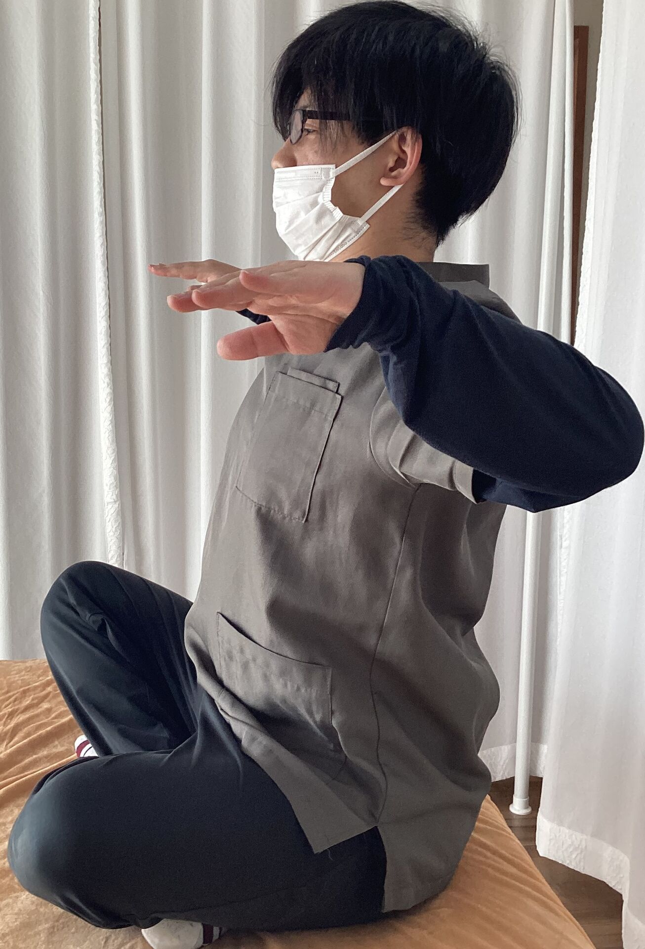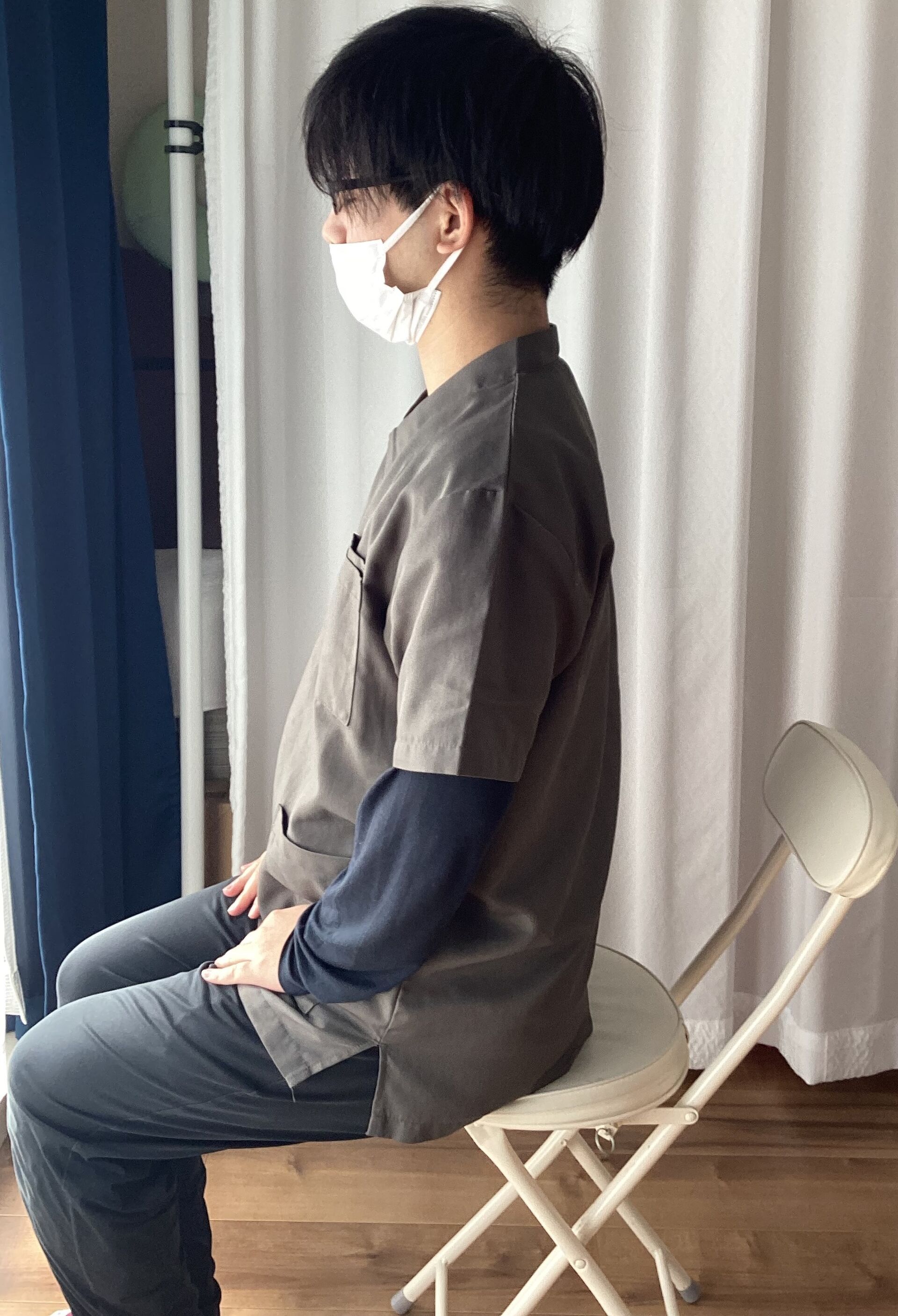 1.まず、あぐらの姿勢になります。イスに座っているかたは浅めに座ってください。
