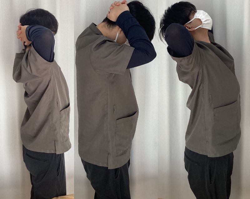 次に、両手を頭の後ろで組み、前に倒したあと、首を後ろに反らします。