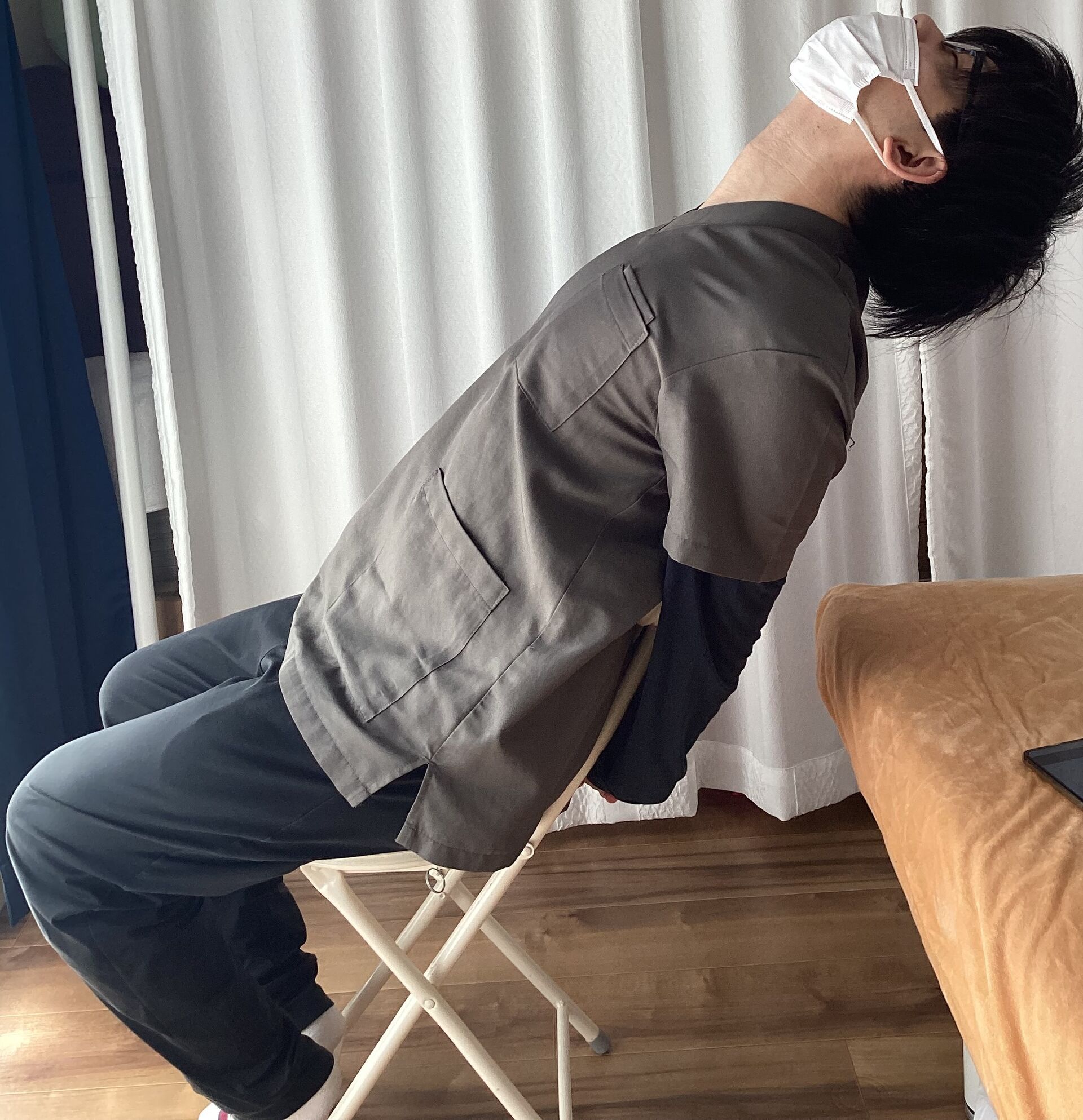 イスに深めに腰掛けリラックスしてください。 背もたれに寄りかかり、顔を上に向け両腕を腰のあたりで組みそのまま後ろに引いていきましょう。胸を張り20秒ほどキープしましょう。