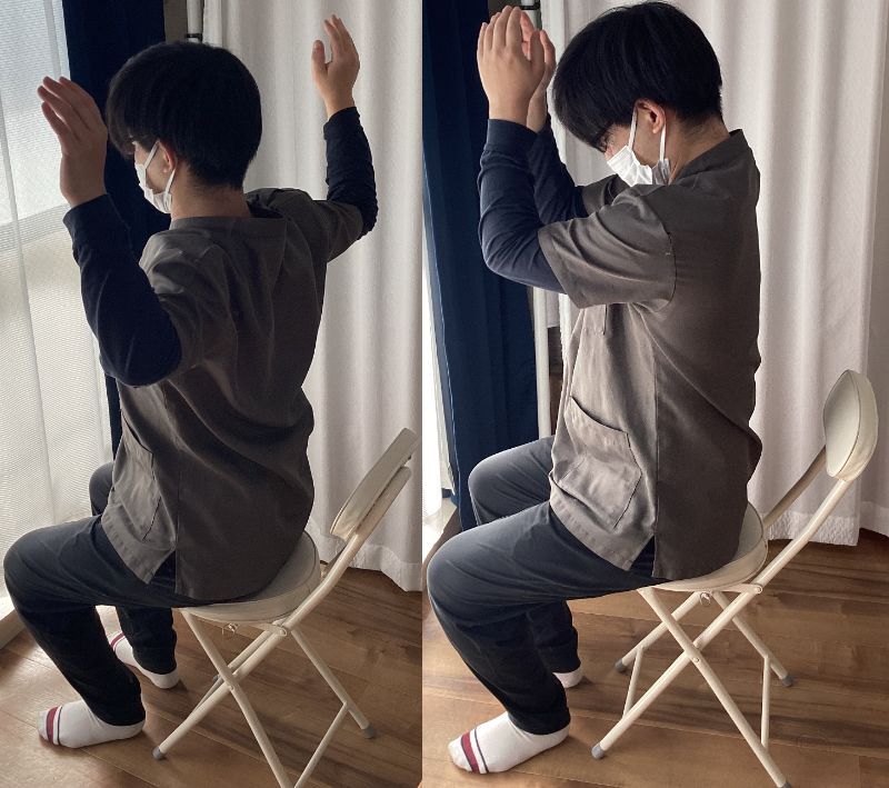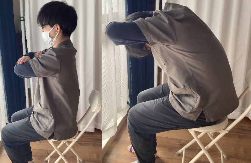 椅子に浅めに座り、両手を胸の前で組みゆっくりと息を吐きながら背中を丸めましょう。