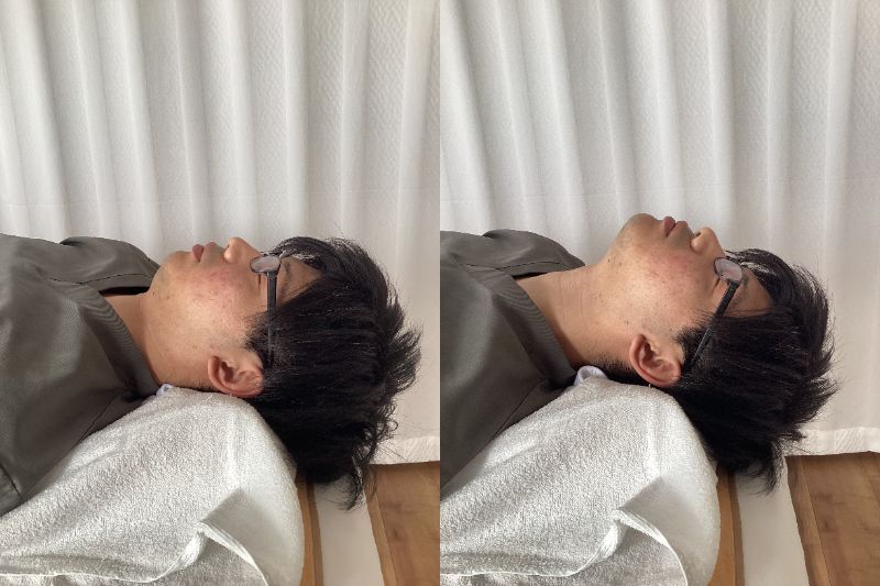 仰向けになり枕やタオルなどの高さのあるものに頭をのせます 目をつぶって顎をあげ、頭の上部を枕にゆだねるようにゆっくりと後ろに伸ばしていきます。